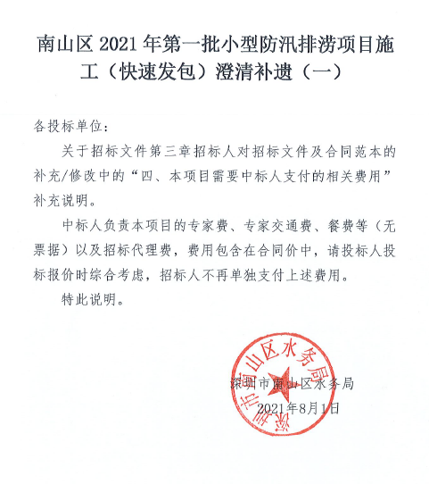 南山區2021年第一批小型防汛排澇項目施工(快速發包)澄清補遺(一)